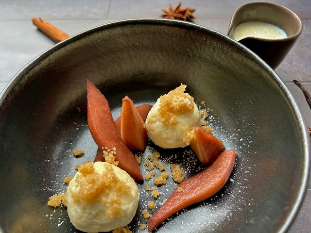 Pochierte Birne | Quarkknödel | Zimtcrumble